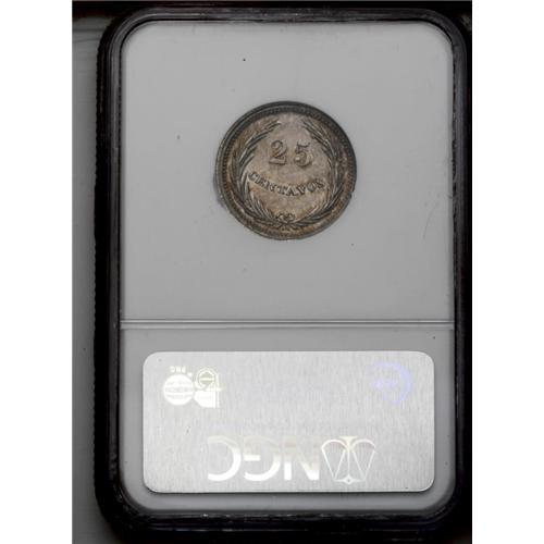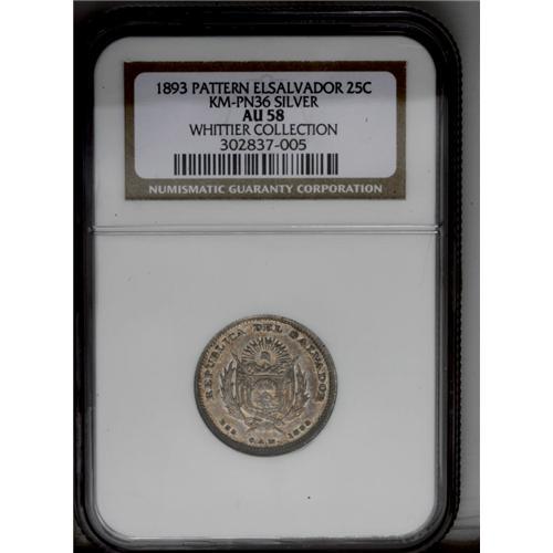 <B>Republic Silver Pattern 25 Centavos 1893-CAM, </B></I>KM-Pn37, AU58 NGC, a choice toned example of this very rare pattern in silver. The 25 Centavos was not issued as a regular type. (The holder incorrectly calls this KM-Pn36.)