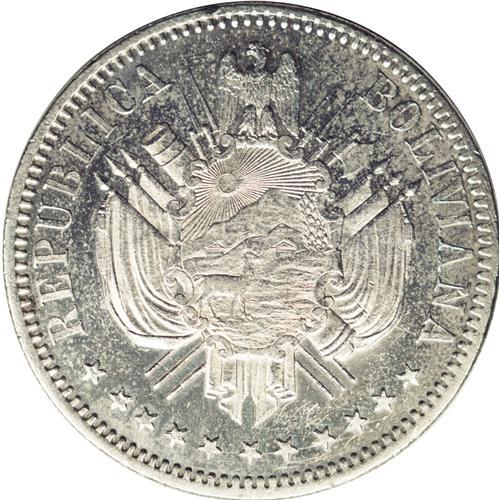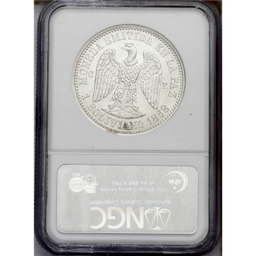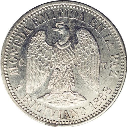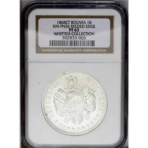 <B>Republic Silver Pattern Boliviano 1868-CT, </B></I>KM-Pn26, reeded edge, Proof 63 NGC, mirror surfaces with minimal handling in the fields. Very rare in silver! Type with value as 1 BOLIVIANO and without E.