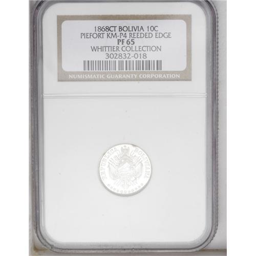 <B>Republic Silver Piefort Pattern 10 Centavos 1868, </B></I>KM-P4, Proof 65 NGC, reeded edge, a brilliant example of this double-thick pattern and far more elusive than the regular thickness issue.