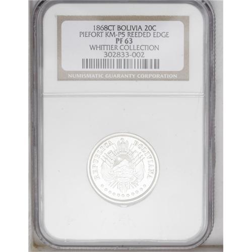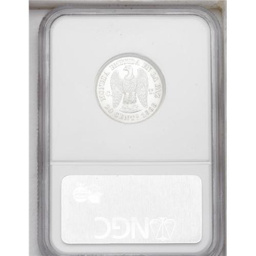 <B>Republic Silver Piefort Pattern 20 Centavos 1868, </B></I>KM-P5, reeded edge, Proof 63 NGC, very sharp details.