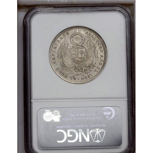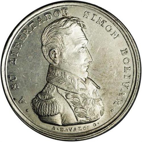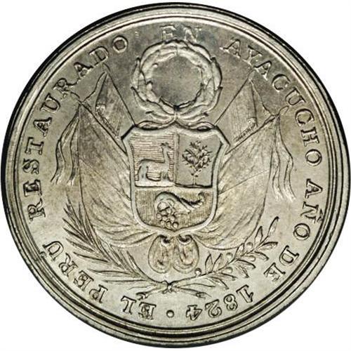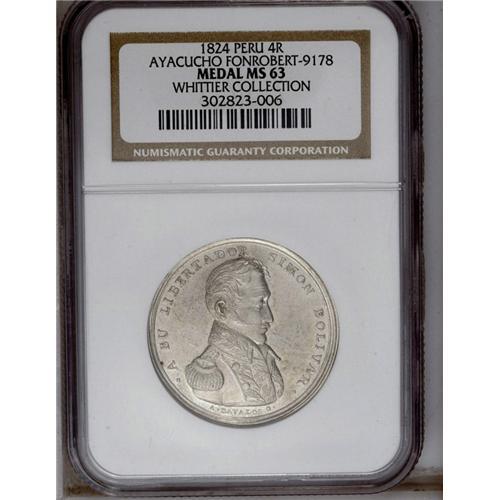 <B>Republic Silver Proclamation 4 Reales 1824, </B></I>Fonrobert 9178, MS63 NGC, prooflike surfaces with light contact marks. Struck to mark the battle of Ayacucho, rare type and grade. The obverse features a fine bust of Simon Bolivar and the reverse displays the Peruvian arms.