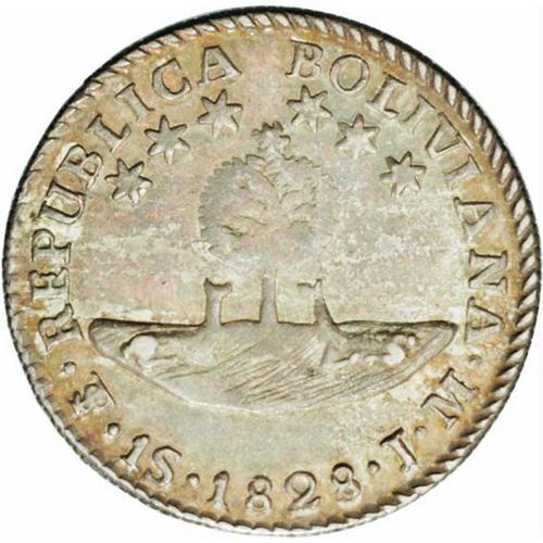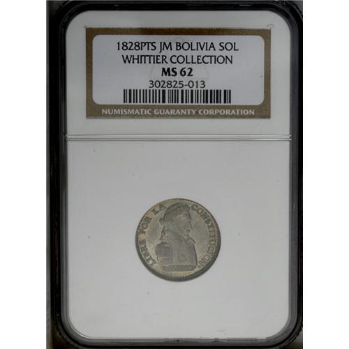 <B>Republic Sol 1828-JM, </B></I>KM94, MS62 NGC, a nice lightly toned example. Mint State specimens of this type are very elusive.