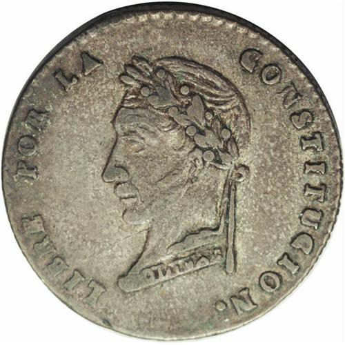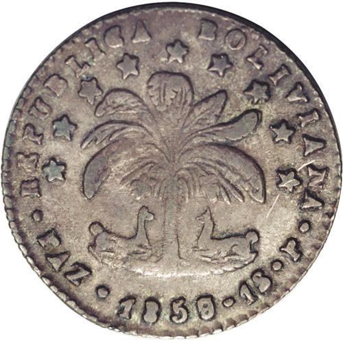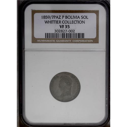<B>Republic Sol 1859/7-P Paz, </B></I>KM131, VF35 NGC, toned VF, one tiny scratch, very rare overdate, only five examples currently reported.