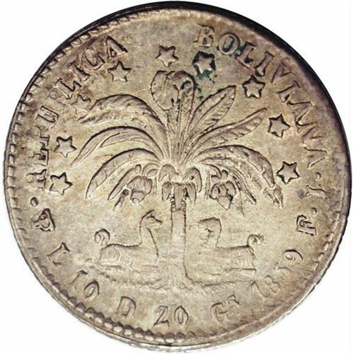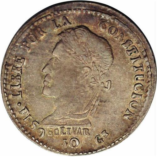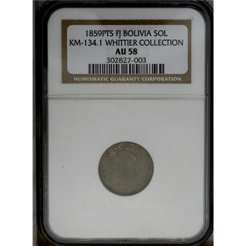 <B>Republic Sol 1859-FJ, </B></I>KM134.1, AU58 NGC, a nicely toned and fully original example of this scarce one-year type with Peso 50 Gs added below the bust. Variety with E/R and U/B in Republica.