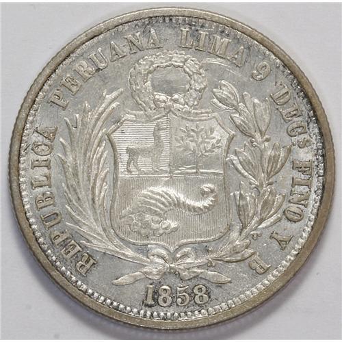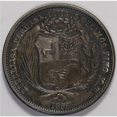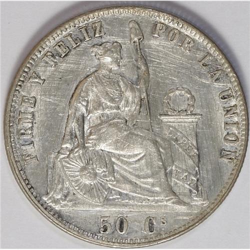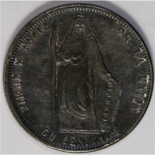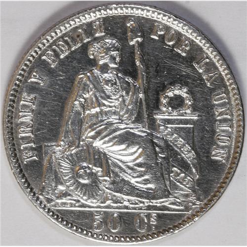 <B>Republic - Trio of Silver Types, </B></I>KM178 50 Centimos 1858-MB, AU, slate gray toning, KM179.1 50 Centavos 1858-YB, AU, heavy hairline scratches on the reverse, and KM179.2 50 Centavos 1859-YB/Y, polished AU, tiny rim nick. <B>Sold as is, no return lot.</B></I>