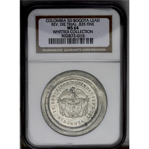 <B>Republic Uniface Die Trial 5 Decimos Bogota ND (1868), </B></I>reverse striking of KM153.1 on a large lead planchet, 835 fineness. MS64 NGC, well-struck and highly lustrous. A fascinating item and certainly very rare.