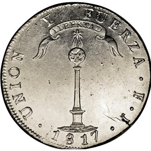 <B>Republic Volcano Peso 1817-FJ, </B></I>KM82.2, variety with Y to the left of the column, lustrous AU, cleaned at one time and with a small natural edge flaw by the J of the assayer.