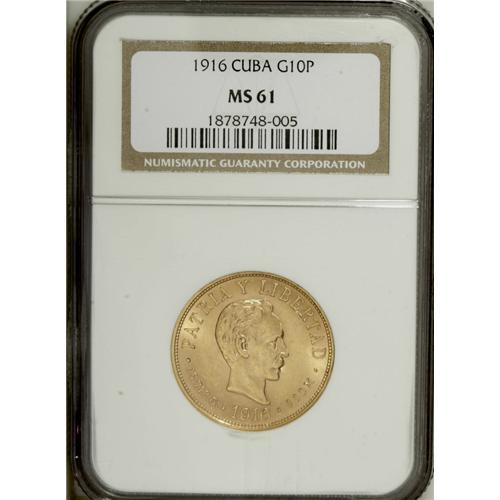 <B>Republic gold 10 Pesos 1916, </B></I>KM20, MS61 NGC, a nice example with lightly toned luster.<BR><BR><b>Shipping:</b> Coin/Currency (<a target="_blank" href="http://www.heritageauctions.com/common/shipping.php">view shipping information</a>)