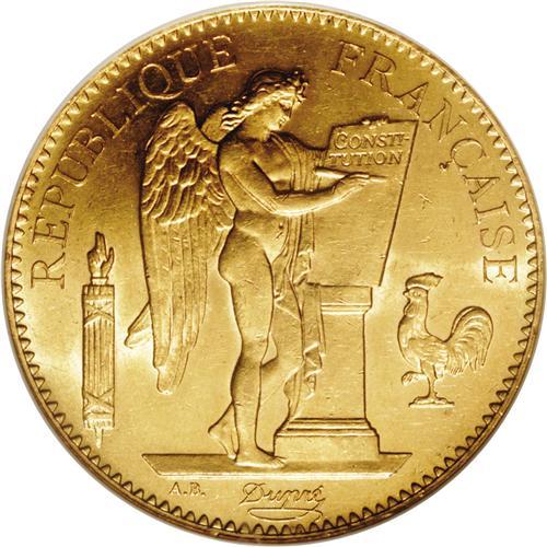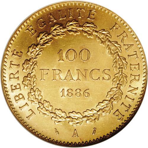 <B>Republic gold 100 Francs 1886A,</B></I> KM832, Fr-590, MS61 NGC. Nice mint luster with lightly abraded surfaces. A very nice example of the grade.