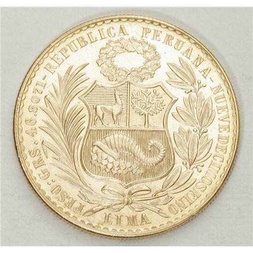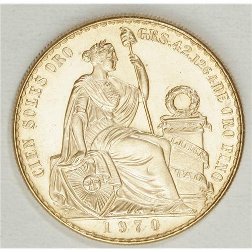 <B>Republic gold 100 Soles 1970, </B></I>KM231, choice BU, tiny mintage of 425.<BR><BR><b>Shipping:</b> Coin/Currency (<a target="_blank" href="http://www.heritageauctions.com/common/shipping.php">view shipping information</a>)