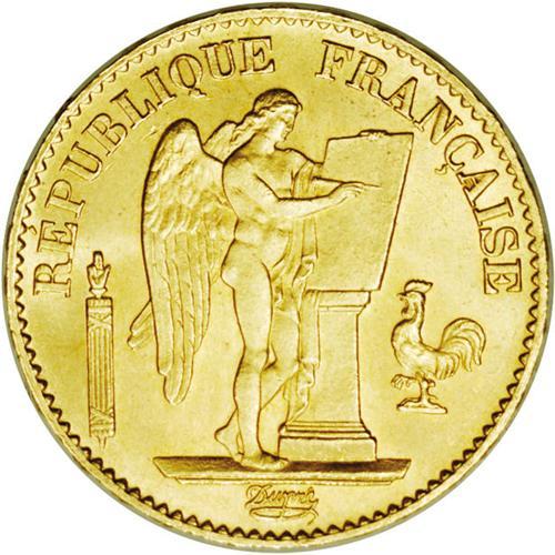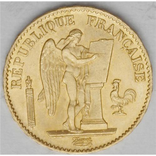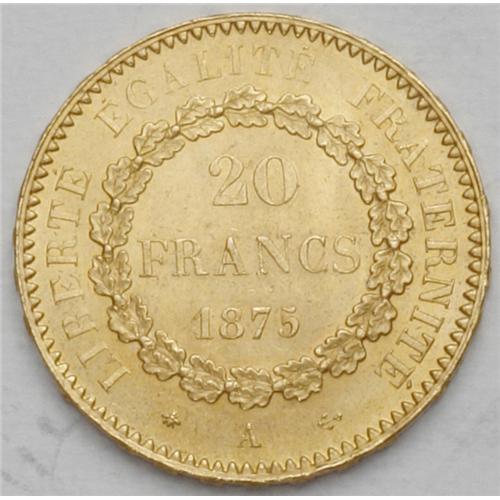 <B>Republic gold 20 Francs 1875A,</B></I> KM825, Fr-592, MS64 NGC. Nice brilliance with minor hairlines that keep this from the Gem category.