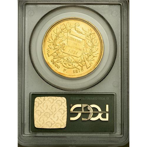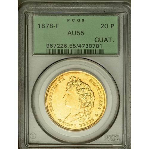 <B>Republic gold 20 Pesos 1878-F, </B></I>KM199, AU55 PCGS, a choice example of this very rare type with full mint luster and just a faint rub on Libertad's cheek. The obverse displays some small contact marks which is normal for this denomination.<BR><BR><b>Shipping:</b> Coin/Currency (<a target="_blank" href="http://www.heritageauctions.com/common/shipping.php">view shipping information</a>)