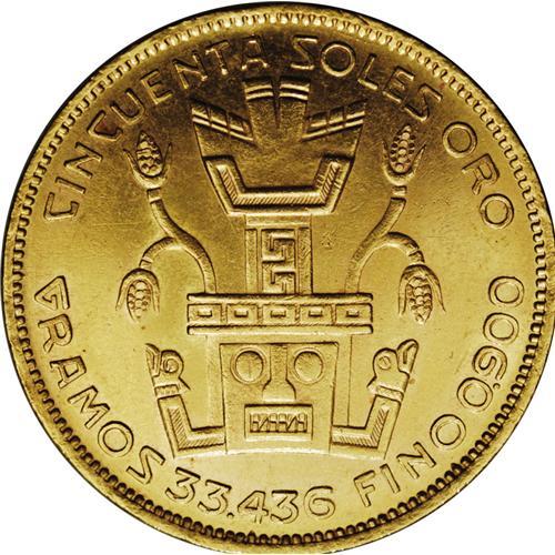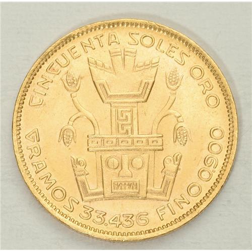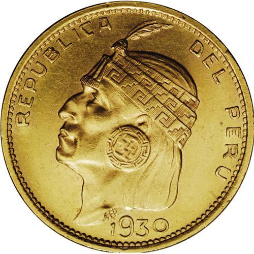 <B>Republic gold 50 Soles 1930, </B></I>KM219, nice AU, tiny edge bump at 12 o'clock on the reverse, very scarce and popular first date of this handsome type.<BR><BR><b>Shipping:</b> Coin/Currency (<a target="_blank" href="http://www.heritageauctions.com/common/shipping.php">view shipping information</a>)