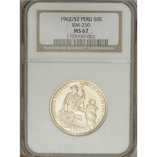 Republic gold 50 Soles 1962/52, KM230, MS67 NGC, a choi