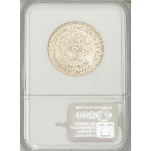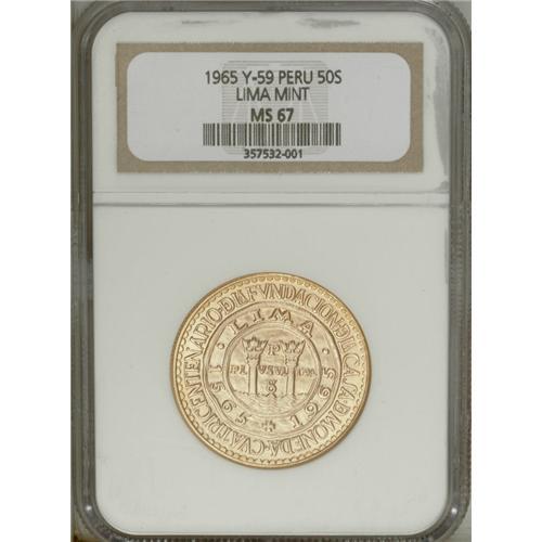 <B>Republic gold 50 Soles 1965, </B></I>KM242, MS67 NGC, struck to commemorate the 400th anniversary of the Lima Mint.<BR><BR><b>Shipping:</b> Coin/Currency (<a target="_blank" href="http://www.heritageauctions.com/common/shipping.php">view shipping information</a>)