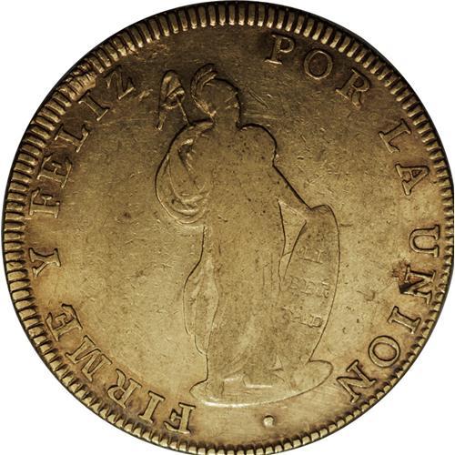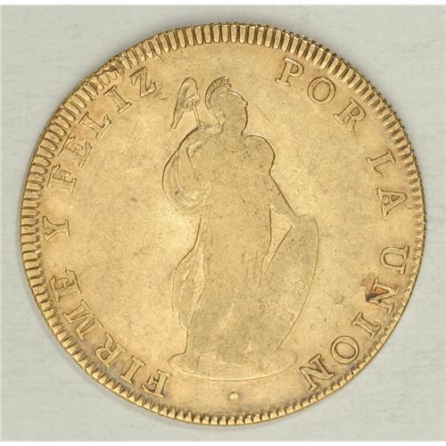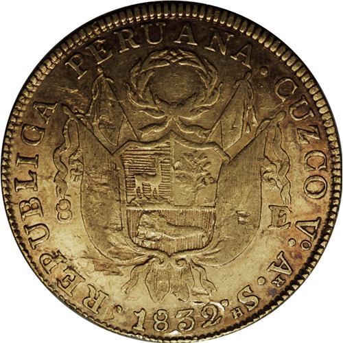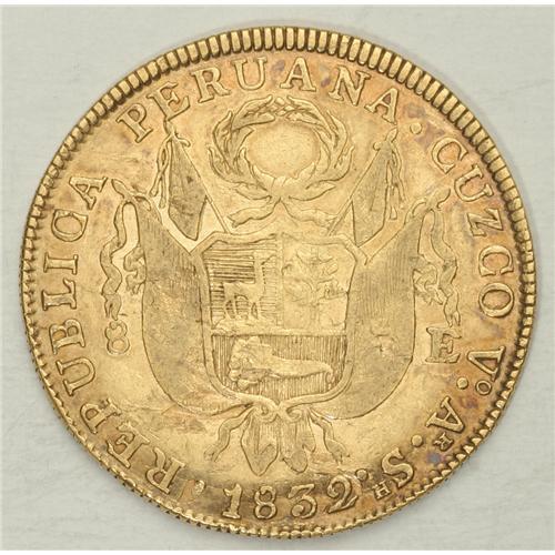 <B>Republic gold 8 Escudos 1832-VoArSh Cuzco, </B></I>KM148.2, toned XF with underlying luster, softly struck on Libertad and one small reverse planchet flaw.<BR><BR><b>Shipping:</b> Coin/Currency (<a target="_blank" href="http://www.heritageauctions.com/common/shipping.php">view shipping information</a>)