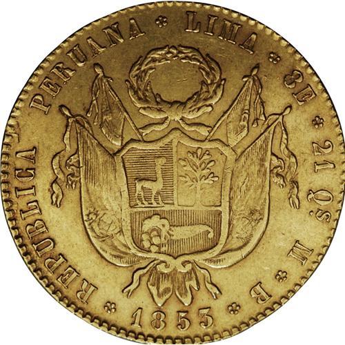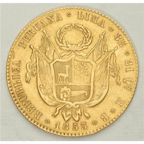 <B>Republic gold 8 Escudos 1853-MB Lima, </B></I>KM148.4, sharp XF+, light scratches in the left reverse field. Very scarce date.<BR><BR><b>Shipping:</b> Coin/Currency (<a target="_blank" href="http://www.heritageauctions.com/common/shipping.php">view shipping information</a>)