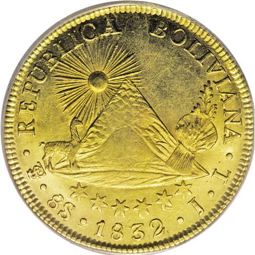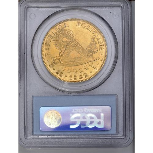 <B>Republic gold 8 Scudos 1832-JL, </B></I>KM99, AU55 PCGS, an attractive example without the usual planchet flaws that plague this issue.