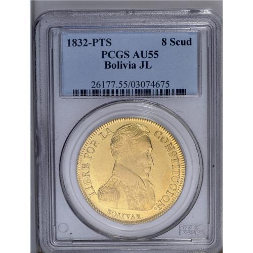 Republic gold 8 Scudos 1832-JL, KM99, AU55 PCGS, an att