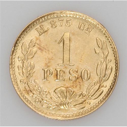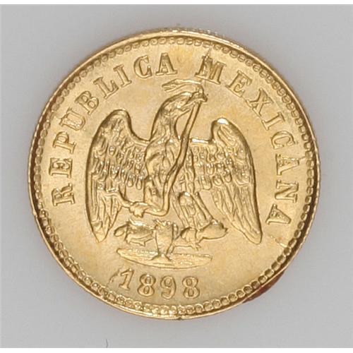 <B>Republic gold Peso 1898/7-CN-M, </B></I>KM410.2, CN/Mo, overdate and over mintmark, nice brilliant UNC, light original toning.