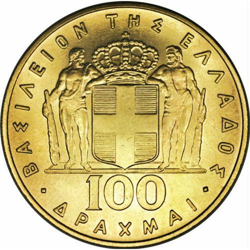 <B>Republic gold Revolution Commemoratives (1970), </B></I>KM92 20 Drachmai, choice BU and KM95 100 Drachmai, choice BU. An exceptionally attractive pair of these popular types.<BR><I> From the Dr. & Mrs. E.E. Banfield Collection.</B></I>