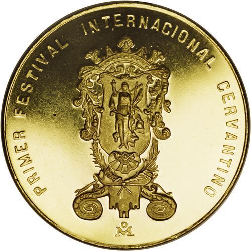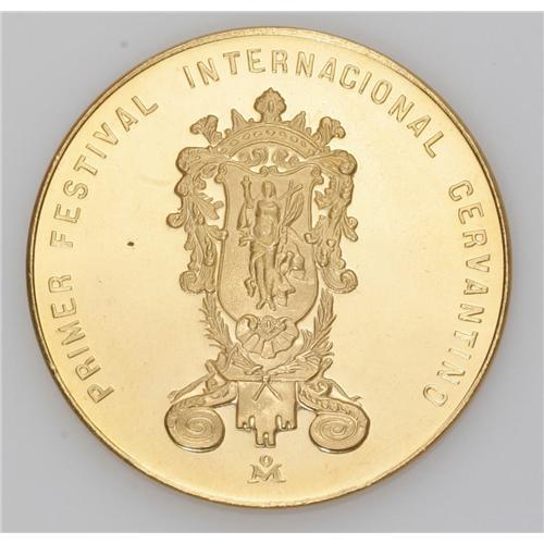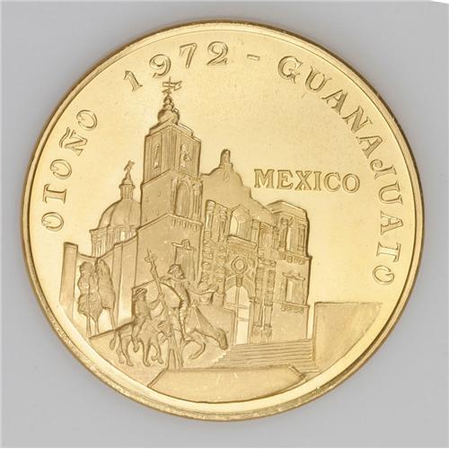 <B>Republic medallic gold 50 Pesos 1972 Mo,</B></I> commemorating the First International Cervantes Festival, Don Quixote and Castle, unlisted in Grove, 41.78 gm, prooflike UNC. Our information says only 20 pieces produced in gold.