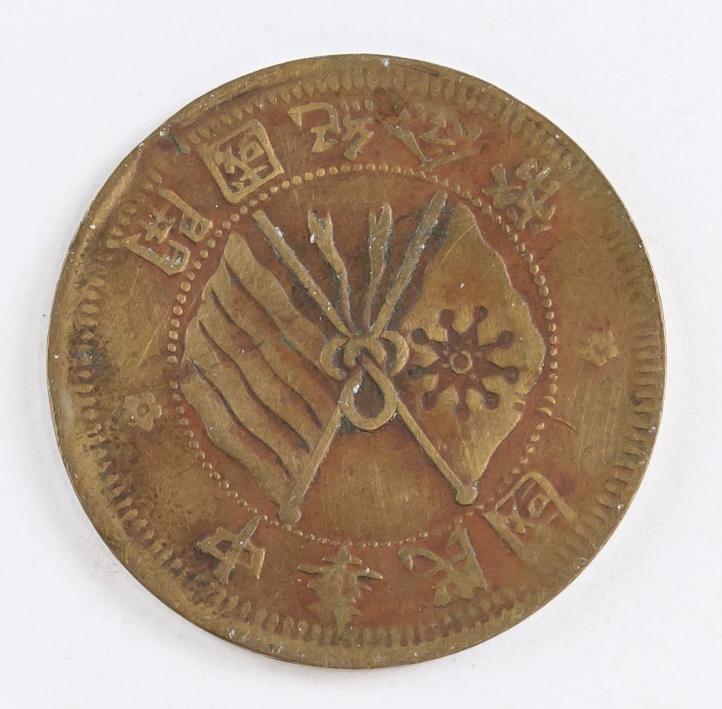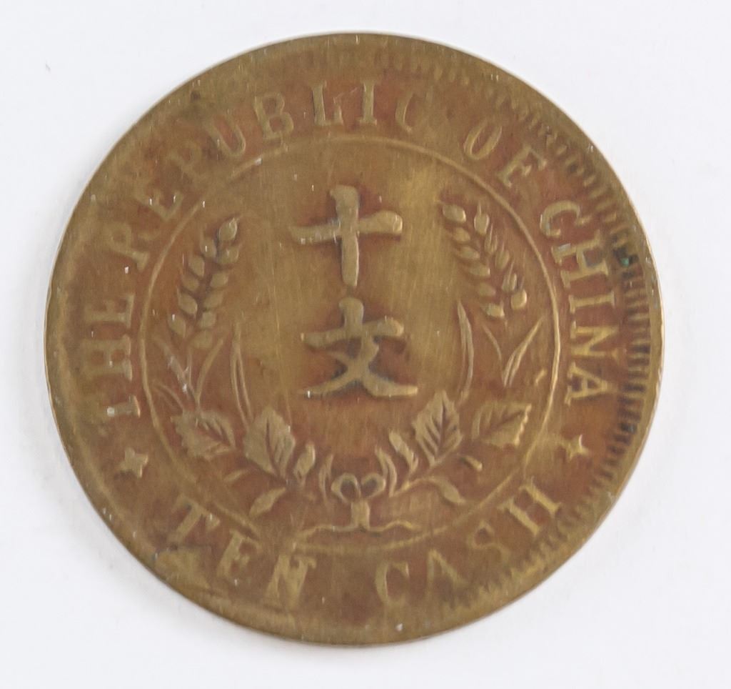 Chinese coin. Commemorating the founding of the Republic. Obverse: Two crossed flags with floral on either side, all with Chinese ideograms above and below. Lettering (romanized): ZHONG HUA MIN GUO / KAI GUO JI NIAN BI. Reverse: Two Chinese ideograms with floral and wheat below, all surrounded by English legend. Lettering (romanized): THE REPUBLIC OF CHINA / SHI WEN / TEN CASH. Diameter: 3 cm. 3 grams
