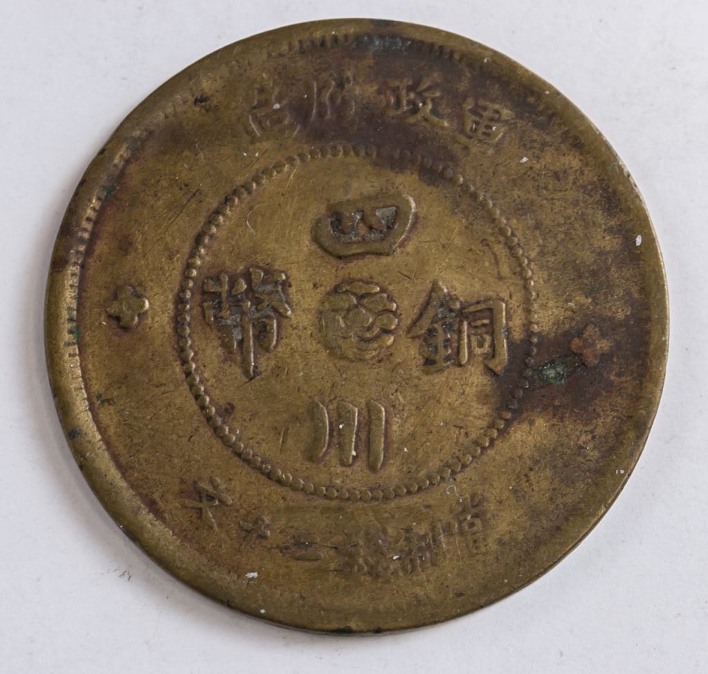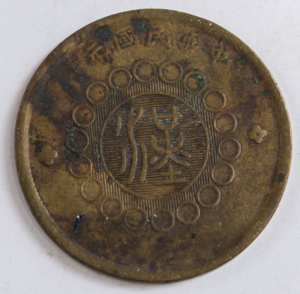 Chinese coin. Obverse: One Chinese ideogram (in Seal script) surrounded by a ring of circles, all with more ideograms above. Lettering (romanized): ZHONG HUA MIN GUO YUAN NIAN / HAN. Reverse: Four Chinese ideograms read top to bottom, right to left with flower at the centre, all surrounded by more ideograms. Lettering (romanized): JUN ZHENG FU ZAO / SI CHUAN TONG BI . DANG ZHI QIAN ER SHI WEN.