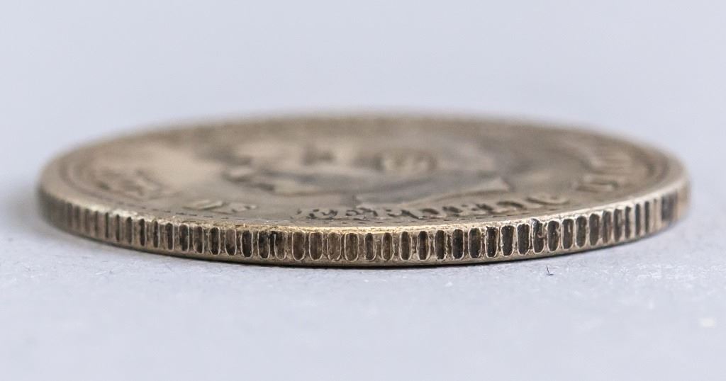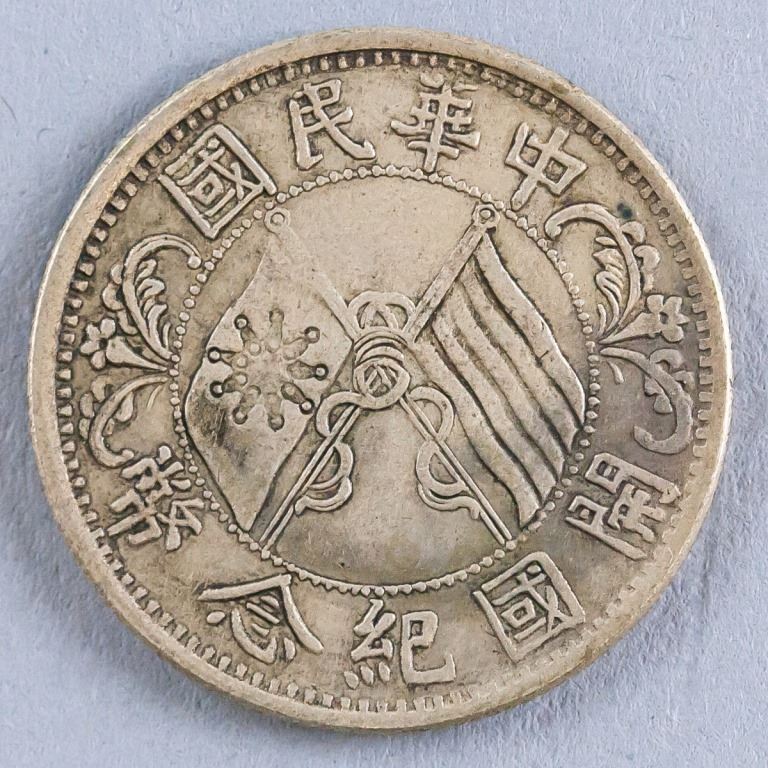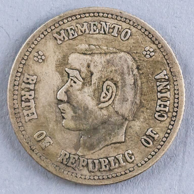 Chinese coin. Commemorating the Birth of the Republic. Obverse: Bust of Sun Yat-sen facing left surrounded by English legend. Lettering: MEMENTO / BIRTH OF REPUBLIC OF CHINA. Reverse: Two crossed flags with floral on either side, all with Chinese ideograms above and below. Lettering (romanized): ZHONG HUA MIN GUO KAI GUO JI NIAN BI. Diameter: 2.5 cm. 6 grams.