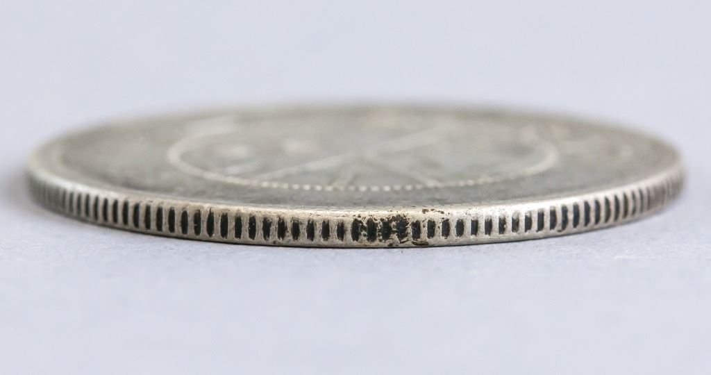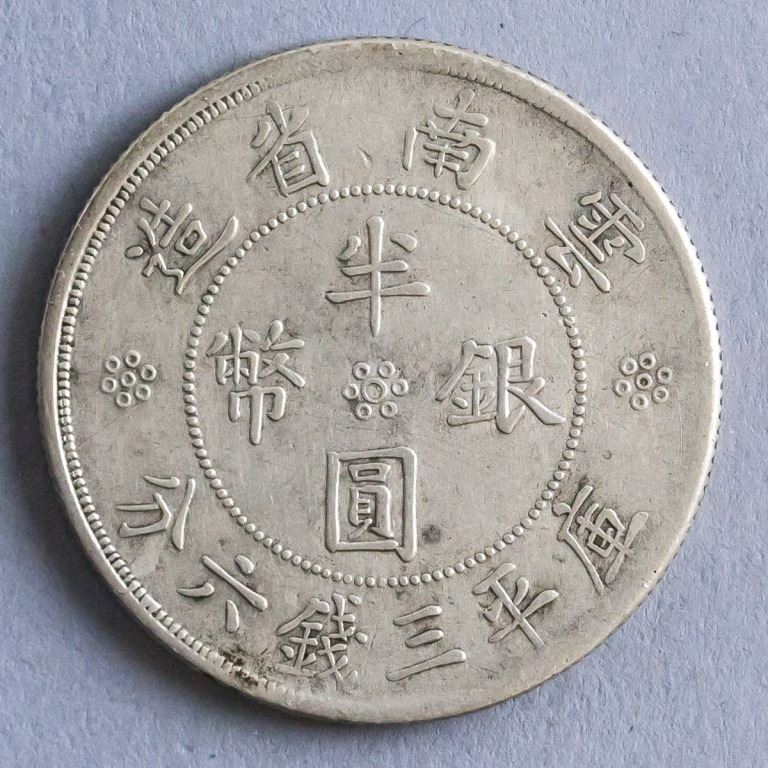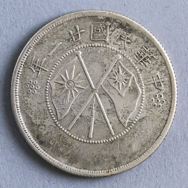 Chinese coin. Obverse: Crossed flags surrounded by Chinese ideograms. Lettering (romanized): ZHONG HUA MIN GUO NIAN YI NIAN. Reverse: Four Chinese ideograms read top to bottom, right to left, all surrounded by more ideograms. Lettering (romanized): YUN NAN SHENG ZAO / BAN YUAN YIN BI / KU PIN SAN QIAN LIU FEN. Diameter: 3 cm. 12 grams.