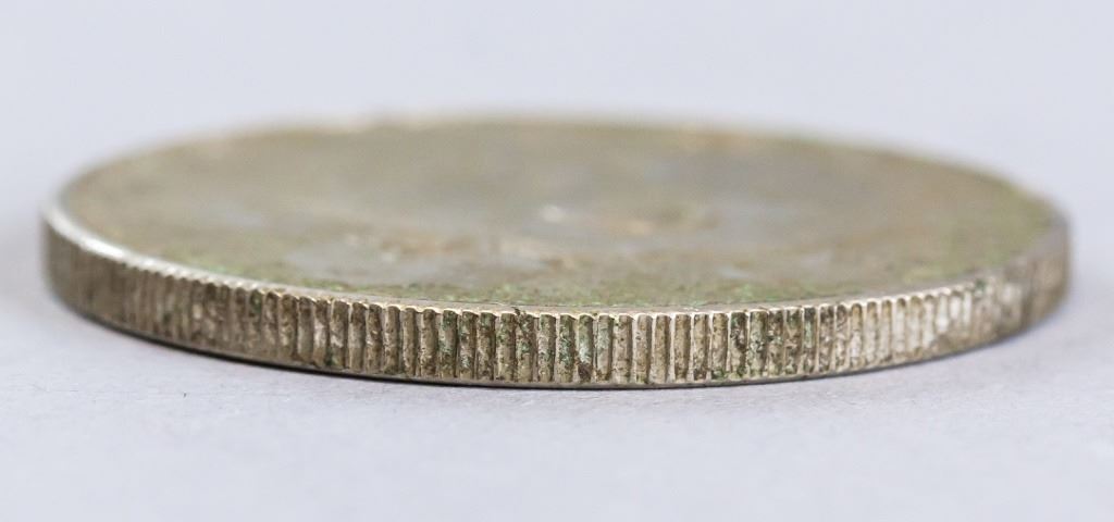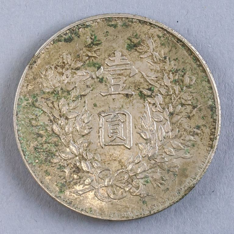 Chinese coin. Obverse: Bust of Yuan Shikai facing left with Chinese ideograms above. Lettering (Romanized): ZHONG HUA MIN GUO SAN NIAN. Reverse: Two Chinese ideograms within wreath. Lettering (romanized): YI YUAN. Diameter: 4 cm. 27 grams.