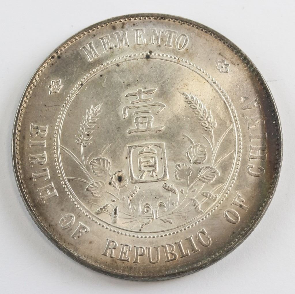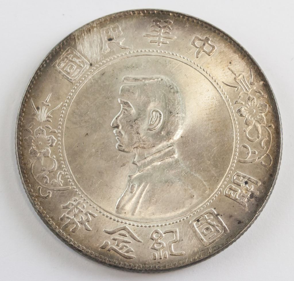 Chinese coin. Obverse: featuring bust of Sun Yat-sen surrounded by Chinese characters reading "[Republic of China Founding Commemorative coin]". Reverse: "[One Yuan]" MEMENTO BIRTH OF REPUBLIC OF CHINA". 26.72 g, density: 10.09.