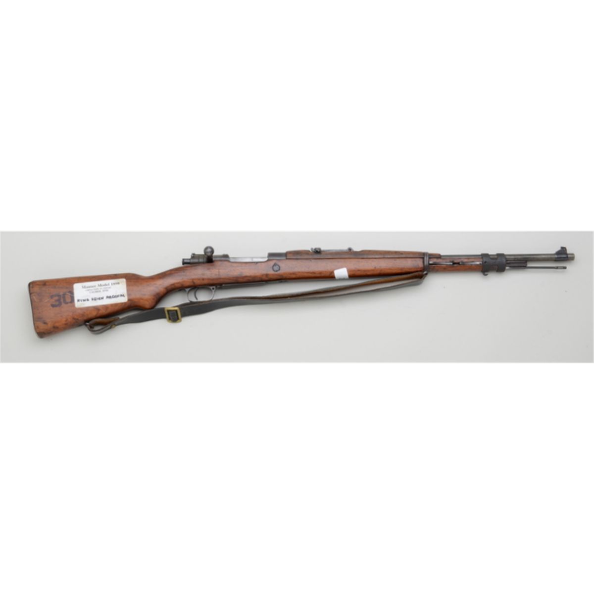 Republic of China Model 14 (Mauser Model 98 pattern) bolt-action rifle made at the Kung Hsien Arsenal, .30-06 cal., 23-1/2” re-barrel, military finish, wood stock, reproduction leather sling, #065244. This gun is in overall good condition with dark patina to metal surfaces, good bore, action and stock showing wear and scattered mars and staining from carry and storage. Est.: $100-$200.