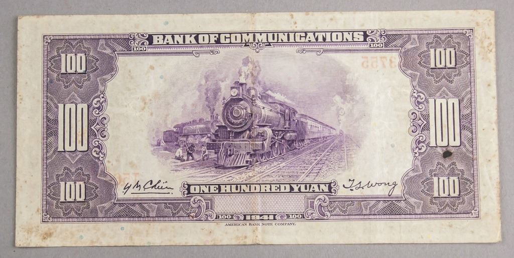 Republic of China paper money. Of denomination 100 Yuan. Issued 1941 by the Bank of Communications.