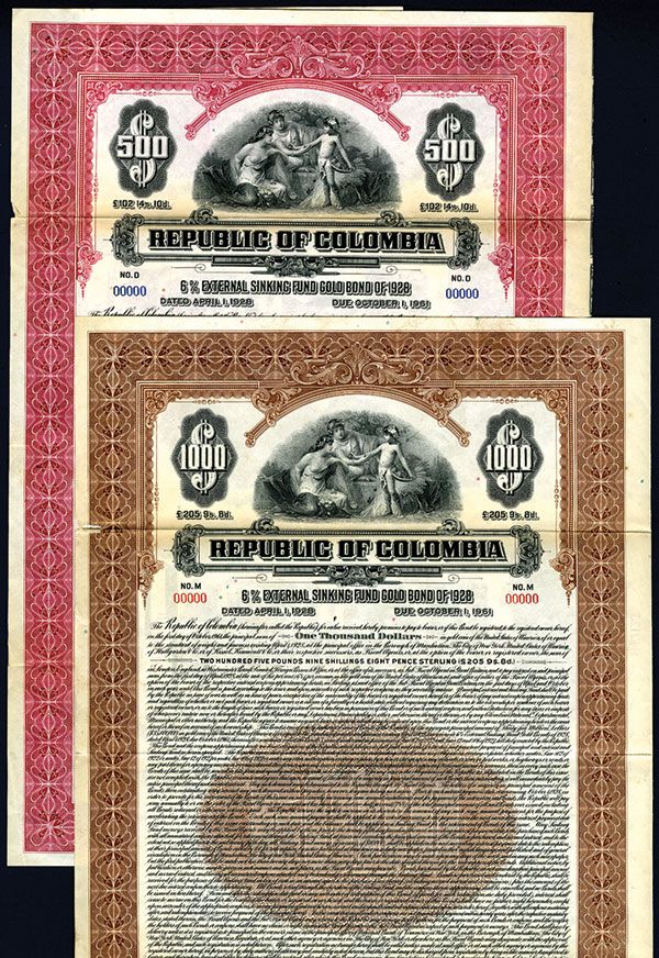 Lot of 2 Colombian Specimen Bonds. 1)$500 or 102.14.10 Sterling 6% Gold Specimen Bond. Black print with rose border and underprint. Allegorical women top center with child. POC's and red SPECIMEN overprint. VF condition. ABNC. 2)$1000 or 205.9.8 Sterling 6% Gold Specimen Bond. Black print with brown border and underprint. Allegorical women top center with child. POC's and red SPECIMEN overprint. VF condition with some splitting. ABNC.