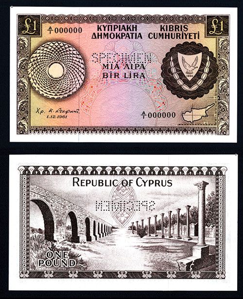 Cyprus, 1961, 1 Pound, P-39s Specimen banknote, arms at right, Pin-punch SPECIMEN overprint, S/N A/1 000000, Uncirculated condition. BWC (without imprint).