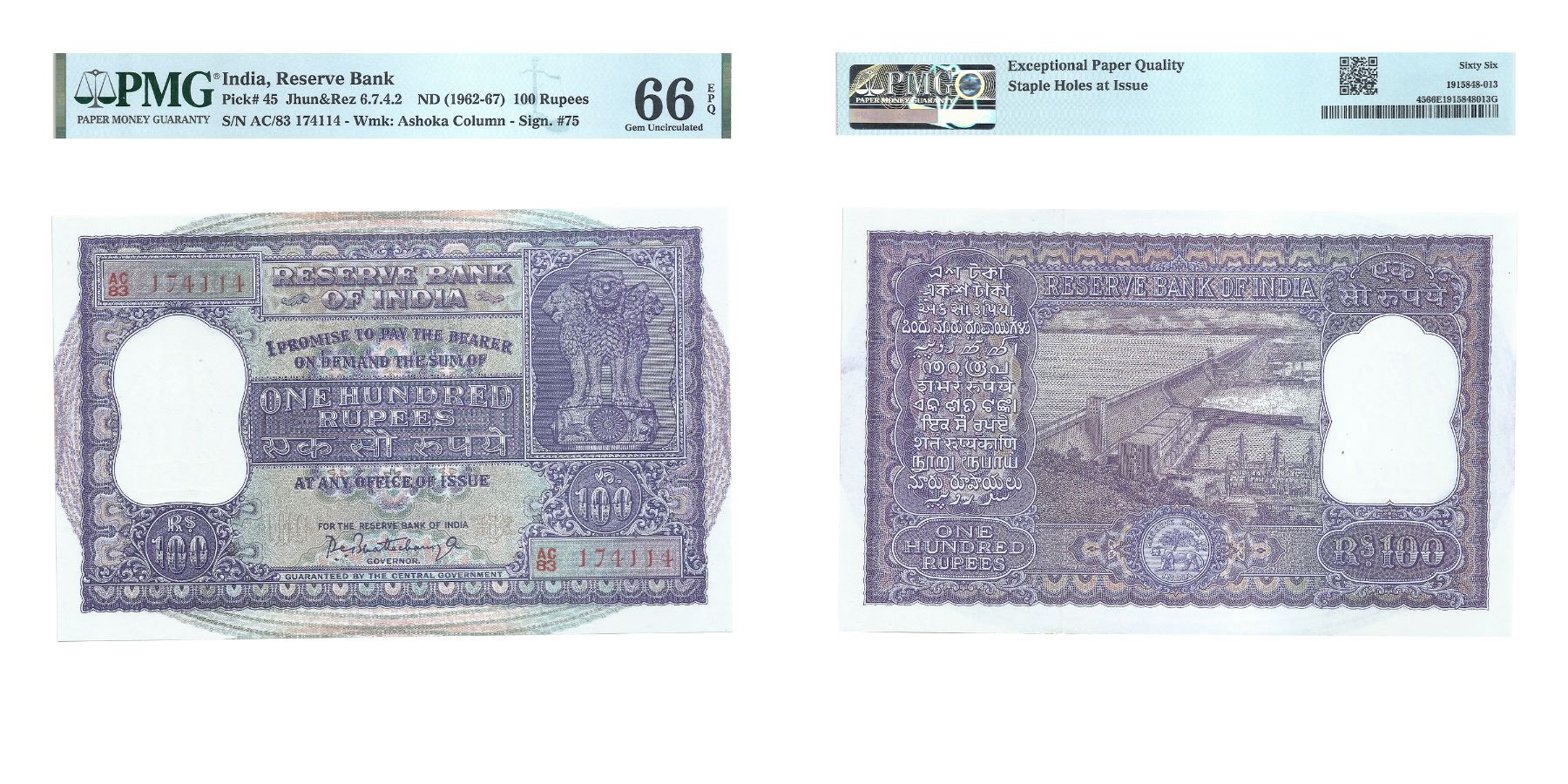 Republic India, 100 Rupees, Signed by P. C. Bhattacharya, S. No. AC83 174114, (KJ & amp; RR # 6.7.4.2), PMG Graded 66 EPQ.