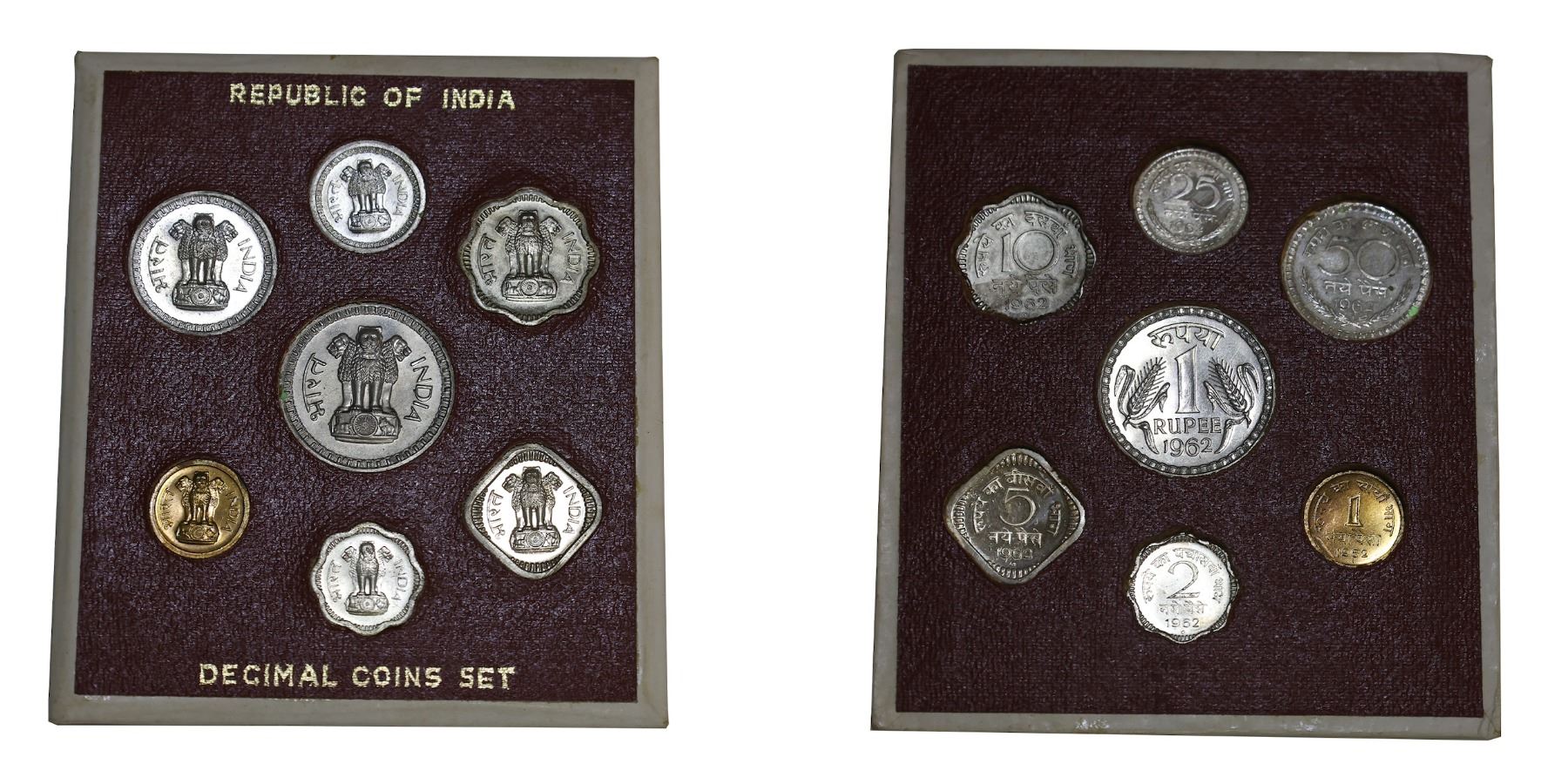 1962, Proof Set, Decimal Coins Set (Regular Series), Set of 7 Coins, 1 Rupee, 50 Naya Paise, 25 Naya Paise, 10 Naya Paise, 5 Naya Paise, 2 Naya Paise and 1 Naya Paisa, Bombay Mint, (RB # 5), Exceptionally Rare.Packed in original red cardboard, Rupee struck from Calcutta mint without a mint mark, this is the only set in Republic India where the set contains a coin struck at the different mint.