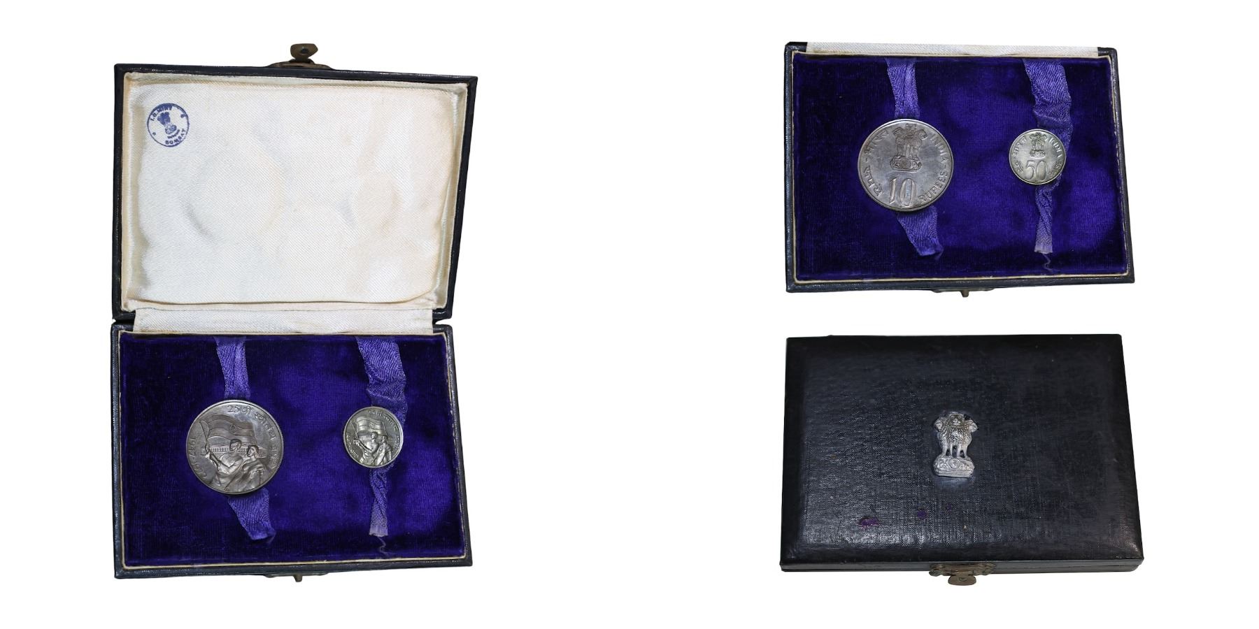 1972, Commemorative, “25th Anniversary of Independenceâ€, Bombay Mint, VIP Unc Coin Set - (acrylic case pack in box), 2 coin set - 10 Rupees & amp; 50 Paise, (RB# 34), with IG mint Bombay case with Emblem, Extremely Fine, Extremely Rare.