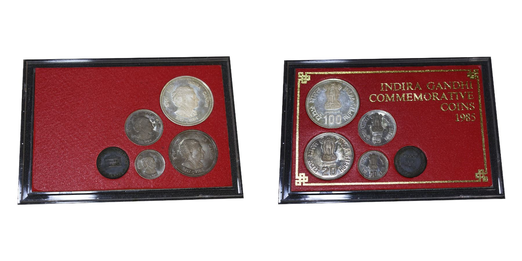 1985, Commemorative, “Indira Gandhi (1917-1984)â€, Bombay Mint, Proof Coin Set- (in acrylic case), 4 coin set – 100 Rupees, 20 Rupees, 5 Rupees & amp; 50 Paise, with single mint token, within original case of issue and certificate, (RB# 110), Extremely Fine, Rare.