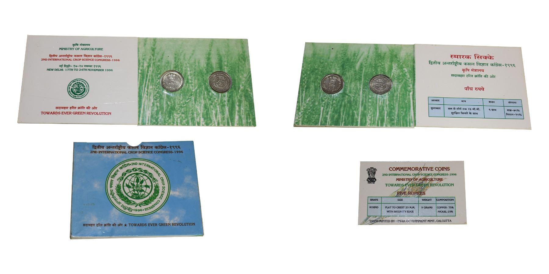 Commemorative,1996, "2nd International Crop Science", Unc set, 5 Rupees (2 Coins of 1st issue ), two coins set blister pack,, Calcutta Mint, (RB# 187), Extremely Fine, Extremely Rare.