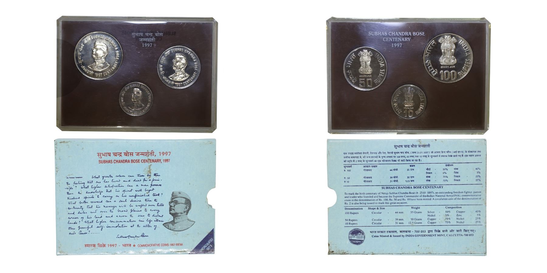 Republic India, Commemorative, 1997 , “Netaji Subhas Chandra Bose (1897-1997)â€, Calcutta Mint, UNC Coin Set- (in acrylic case), 3 coin set – 100 Rupees, 50 Rupees, 10 Rupees, within mint cardboard case, (RB# 194). Extremely Fine