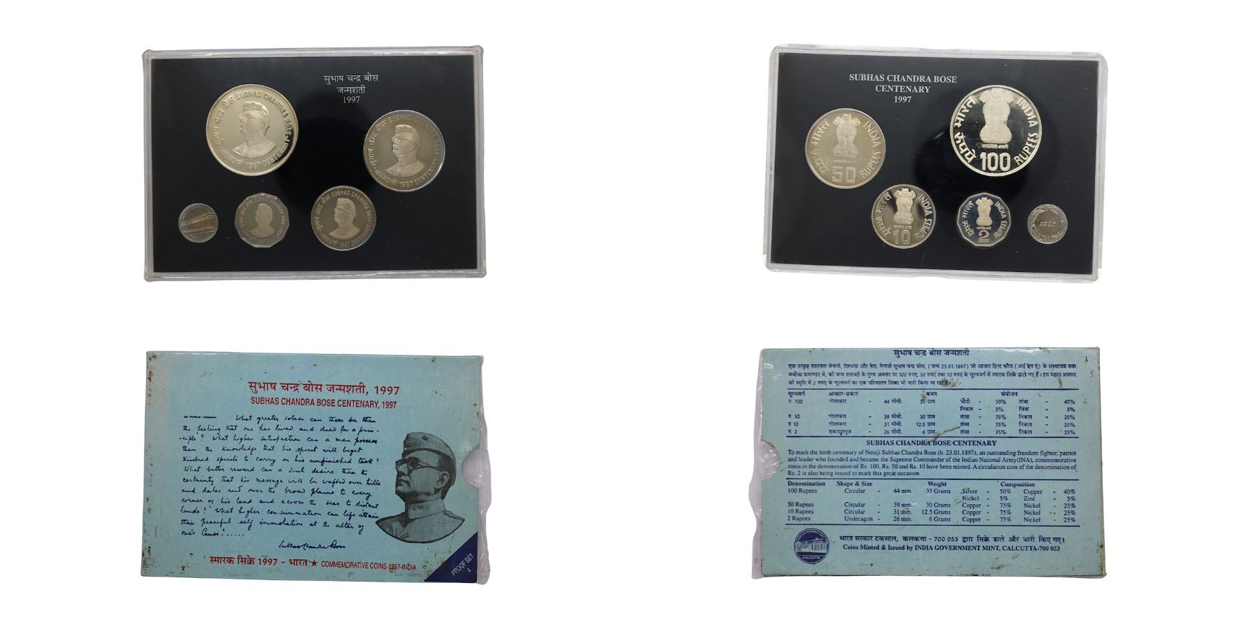 Republic India, Commemorative, 1997 , “Netaji Subhas Chandra Bose (1897-1997)â€, Calcutta Mint, Proof Coin Set- (in acrylic case), 4 coin set – 100 Rupees, 50 Rupees, 10 Rupees & amp; 2 Rupees, with single mint token, within mint cardboard case, (RB# 191), Extremely Fine, Rare