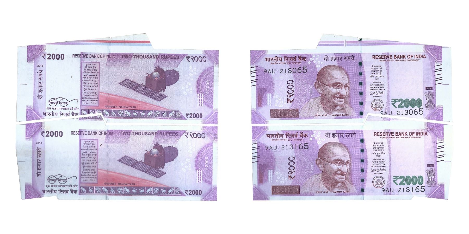 Error, 2000 Rupees, Reserve Bank of India, Signed by Urjit Patel, Sheet fold cutting error, Extremely rare, EF+.