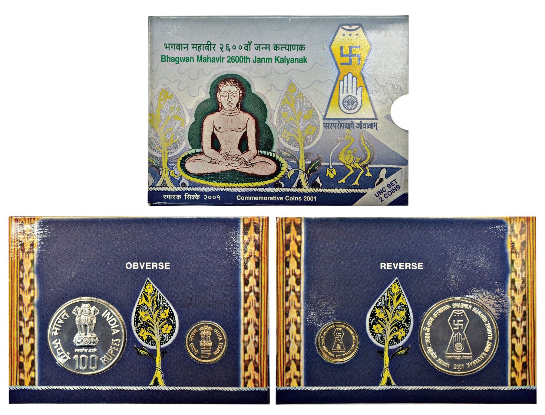 Republic of India: 2001, Bhagwan Mahavir-2600th Janm Kalyanak, UNC set of 2 coins, 100 rupees and 5 rupees, Mumbai mint, RB 242, in original mint packing.