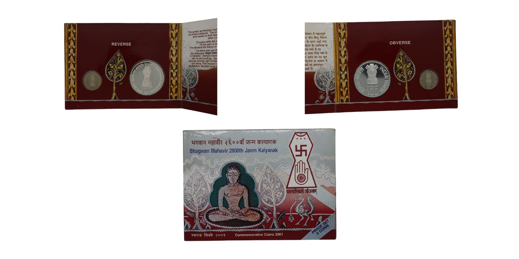Commemorative, 2001 , “Bhagwan Mahavir-2600th Janm Kalyanakâ€, Mumbai Mint, Proof Coin Set- (in blister pack), 2 coins set – 100 Rupees & amp; 5 Rupees, within mint case, (RB# 241) Extremely Fine