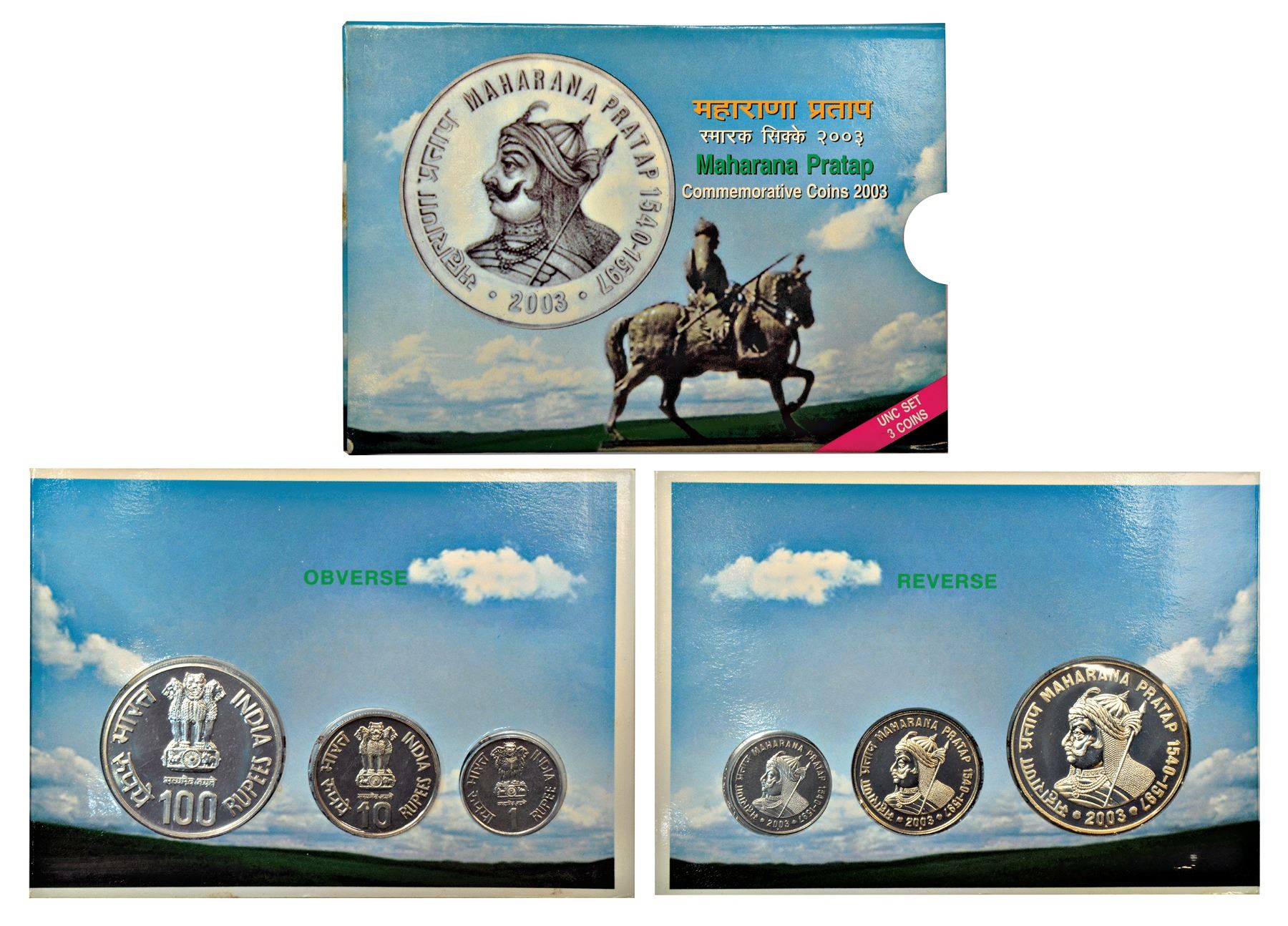 Republic of India: 2003, Maharana Pratap, UNC set of 3 coins, 100 rupees, 10 rupees and 1 rupee, Mumbai mint, RB 263, in original mint packing.
