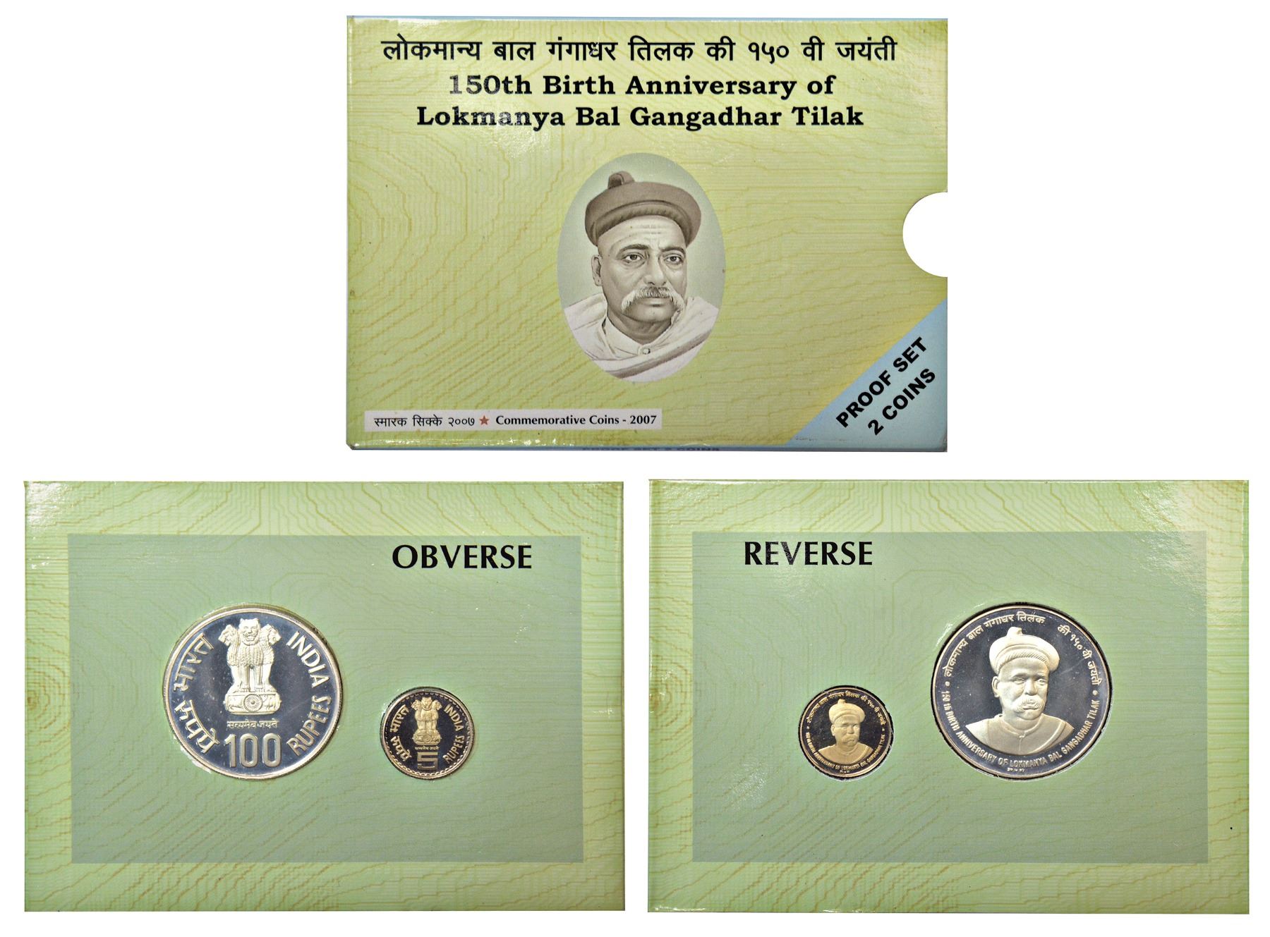 Republic of India: 2007, 150th Birth Anniversary of Bal Gangadhar Tilak, Proof set of 2 coins, 100 rupees and 5 rupees, Mumbai mint, RB 312, in original mint packing.