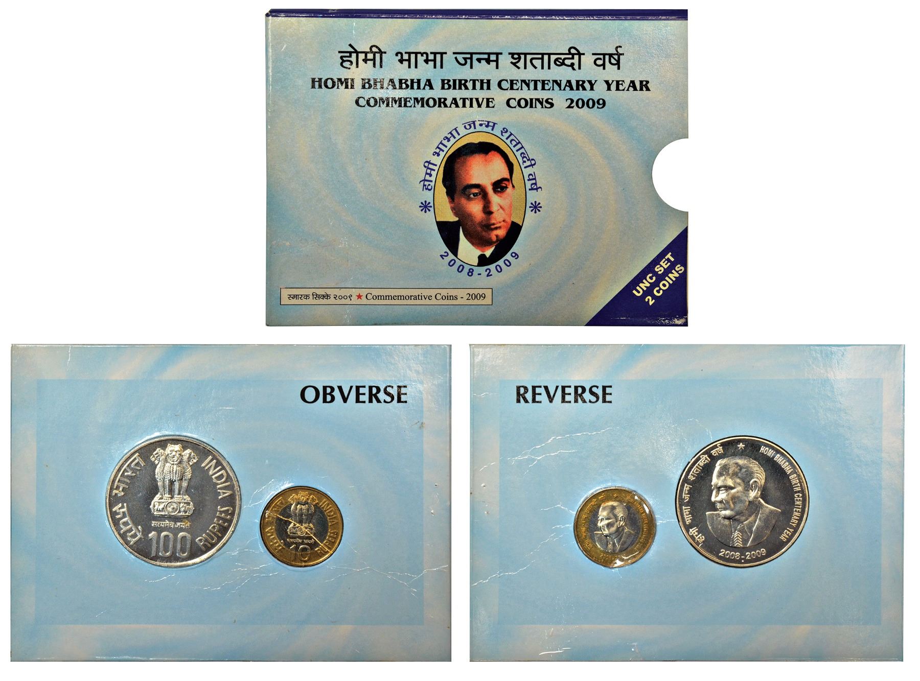 Republic of India: 2009, Homi Bhabha Birth Centenary, UNC set of 2 coins, 100 rupees and 10 rupees, Mumbai mint, RB 356, in original mint packing.