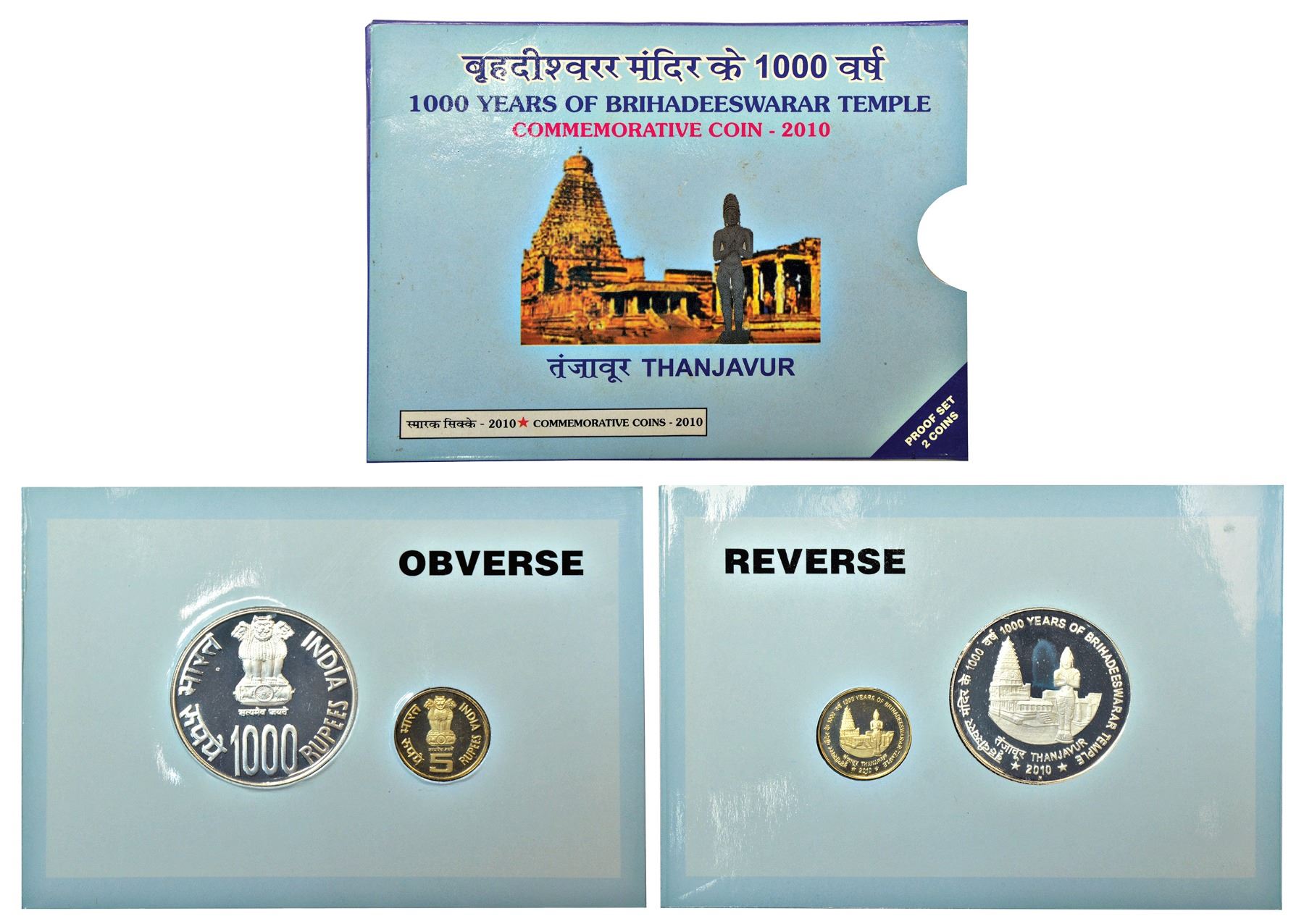 Republic of India: 2010, 1000 Years of Brihadeeswarar Temple, Proof set of 2 coins, 1000 rupees and 5 rupees, Mumbai mint, in original mint packing.